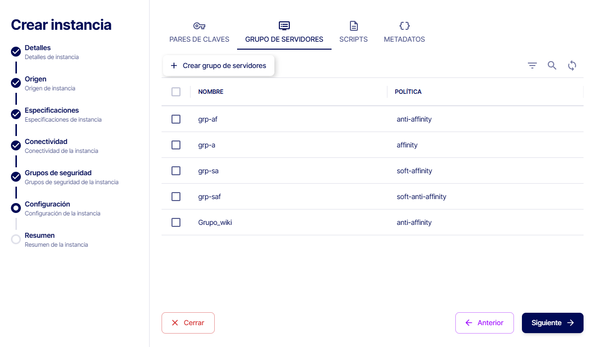 Al crear la instancia, en el apartado "Configuración" hay un menú en la parte superior que si lo seleccionamos, se mostraran todas los grupos de servidores creados en el proyecto así como crear uno nuevo.