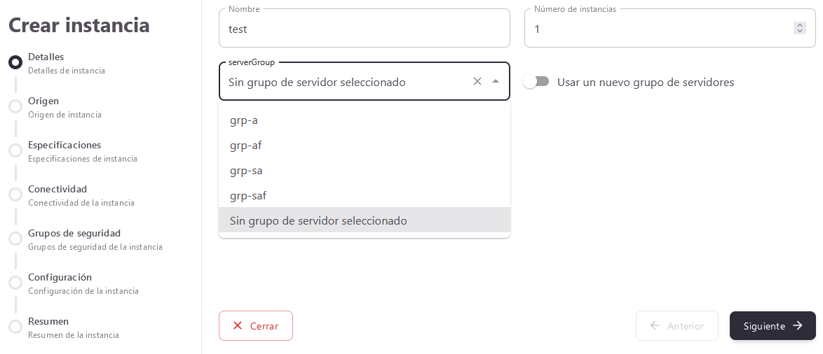 Al crear la instancia, en el apartado "Detalles" hay un menú desplegable donde se muestran todas los grupos de servidores creados en el proyecto.